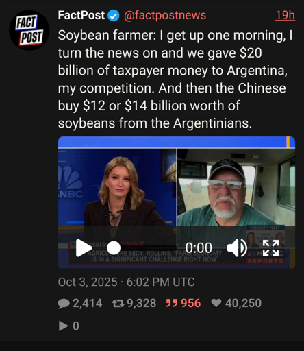 yoasif@fedia.io · 2 months agoBailouts for the Soyboys: Soybean Farmers Surprised by the Trade War They Voted Forplus-squarewww.youtube.comexternal-linkmessage-square0linkfedilinkarrow-up118arrow-down14