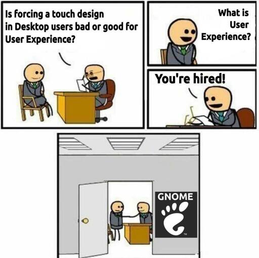 And that is why this meme is dead on the money. I’ve come to hate dev teams that have “visions” that they cram down users throats regardless of the experience. And the irony is that Gnome 2 used to be much more configurable than older KDE versions.