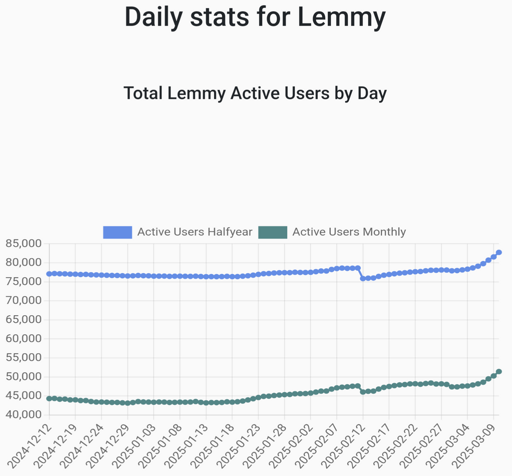 arrow-up12.45Karrow-down1imageThere's a clear up tick on daily users growing and we've crossed the 50k line as of yesterday! LETSSS GOOO!locklemmy.worldcm0002@lemmy.world to Fediverse@lemmy.worldEnglish · 10 months agomessage-square578linkfedilink