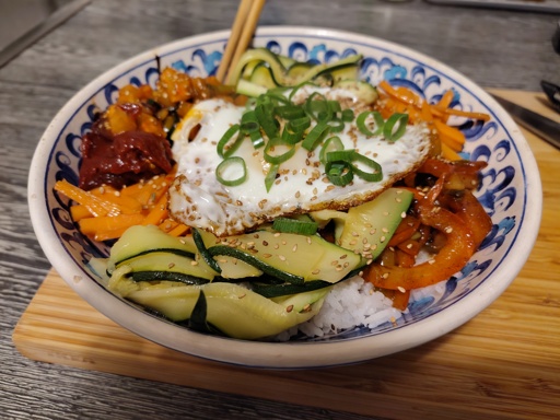 Bibimbap is a rice bowl with warm toppings that are mixed right before eating (pic is pre-mixed) and typically a soft fried egg and some Gochujang (Korean chili paste) to make it saucy. Not a strict recipe, you can use whatever you have in the fridge.