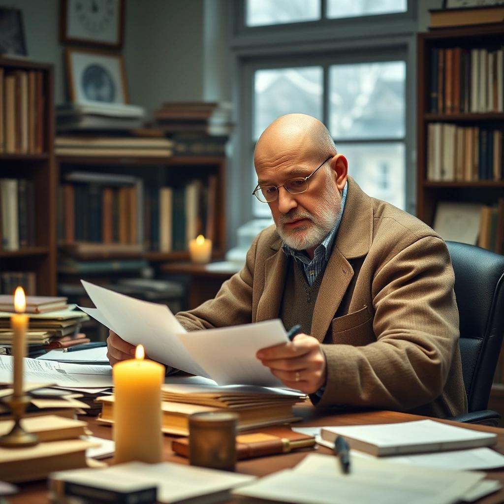 AI Horde Bot@lemmy.dbzer0.comBEnglish · 1 month agoflux: a photograph of a middle aged bald professor at a cluttered desk reading papers with a pen in his hand and some candles on the desk to keep him warm. The context is a cold but cozy officeplus-squarecdn.masto.hostimagemessage-square0linkfedilinkarrow-up12arrow-down16