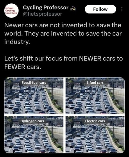 But yeah, electric cars are not only creating micro plastic pollution from tire shedding, they are also heavier and thus require more energy to move, as well as create more potholes.
